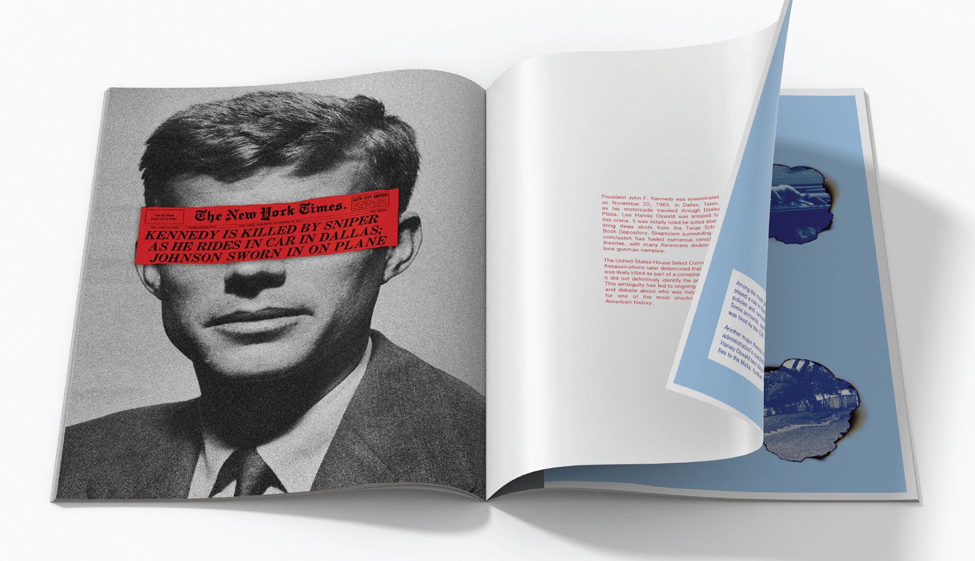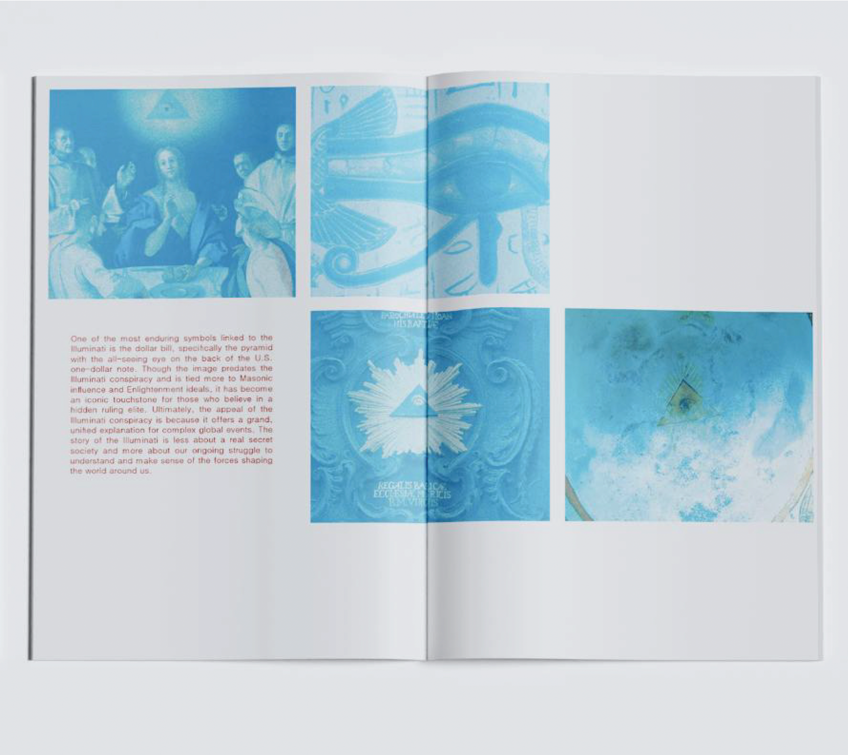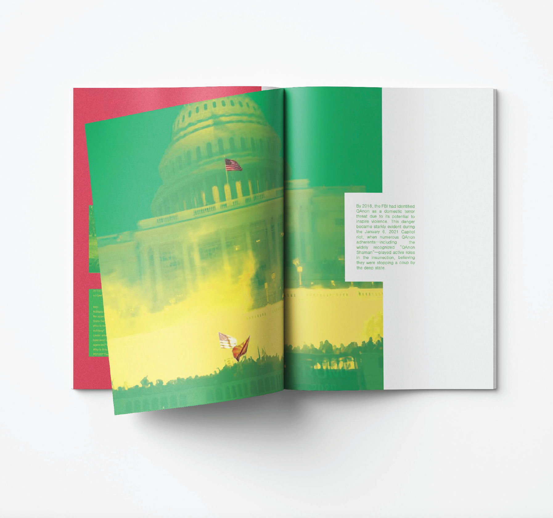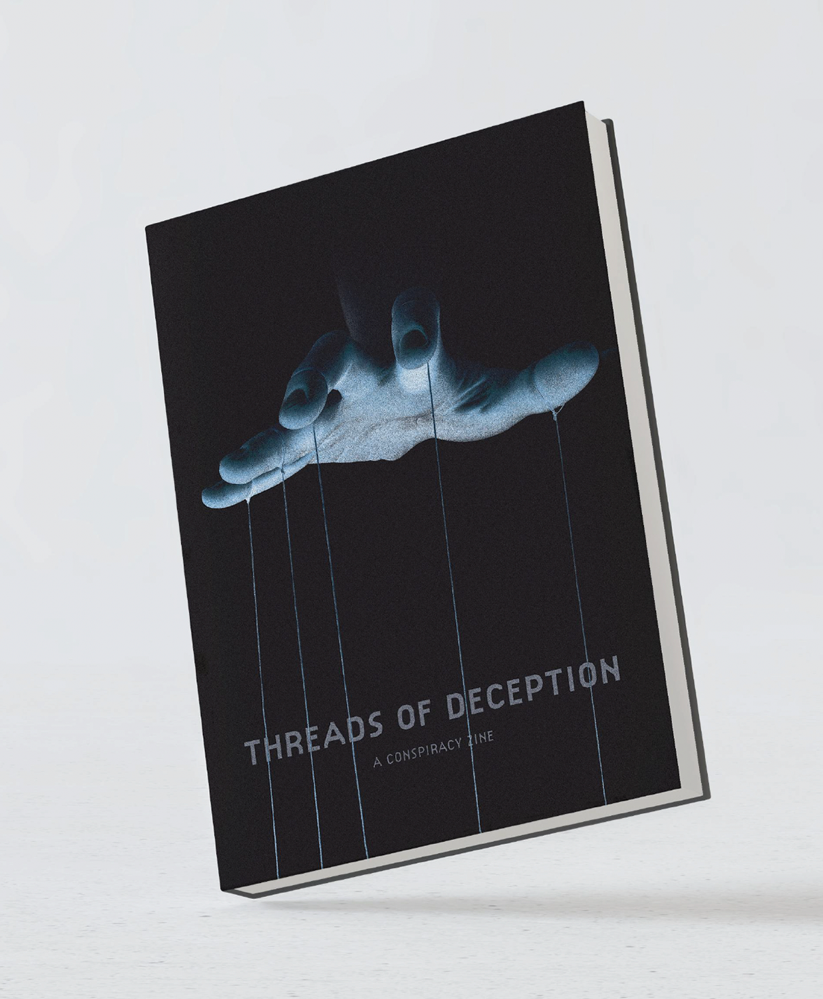 Over 12 weeks, a 40-page zine was developed to visually and typographically explore four major American conspiracy theories: the JFK assassination, Area 51, QAnon, and the Illuminati. Through experimental layouts, bold imagery, and narrative typography, the zine encourages readers to question official narratives, reflect on the influence of misinformation, and consider the cultural forces that allow these theories to persist.