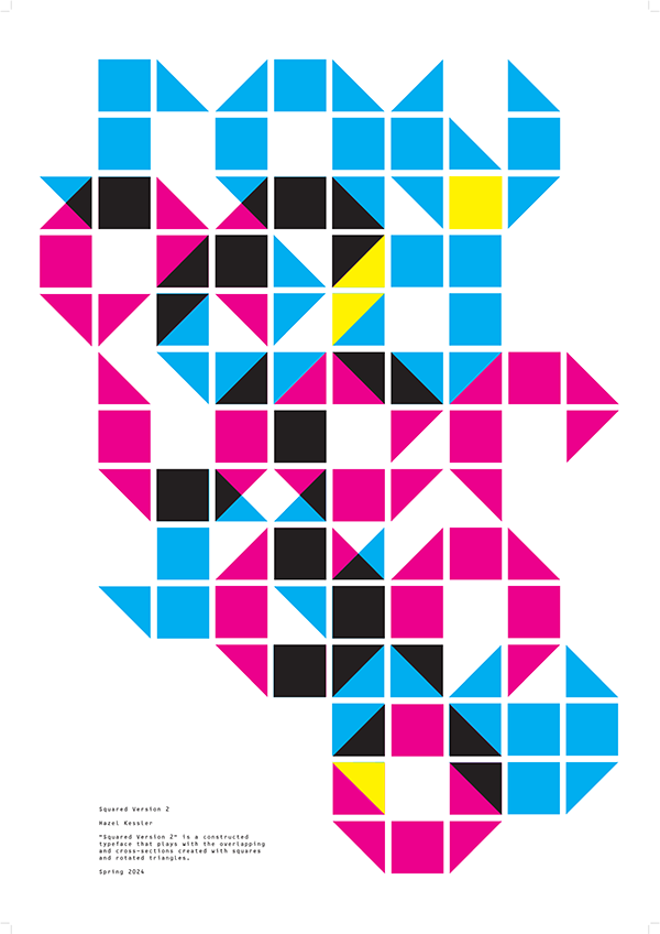 These images showcase a complete typeface designed using a custom grid system I developed. Through studying kerning and letterform relationships, a constructed script that intentionally pushed the boundaries of legibility was created. To further explore the typeface’s visual possibilities, I produced the last poster, which features an abstracted rendering of its name, “Squared Version 2.” This project introduced the software Glyphs.